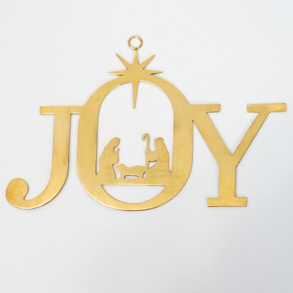 A beautiful Christmas Joy Nativity ornament is handmade from brass in the Kibera slums of Nairobi, Kenya.